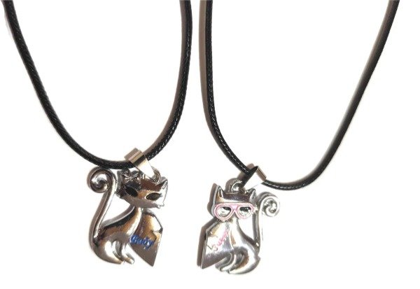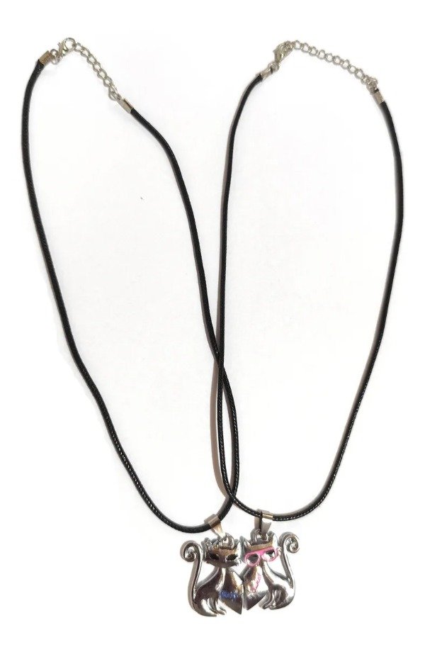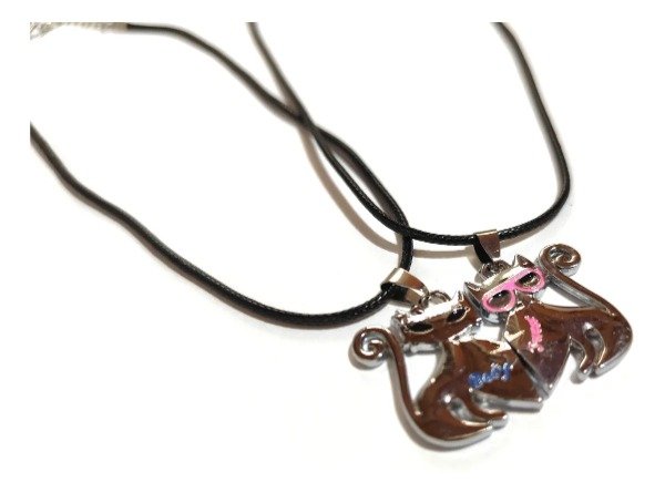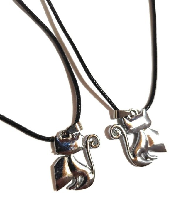 Media de medalla de acero quirurjico. Nueva. Diseño gatitos corazon. Ambas son plateadas, uno con detalles en rosa y la otra con detalles en celeste. Colgante de plastico con cadenita de metal. Cada dije mide 2cms de alto x 2cms de ancho. Largo del colgante 23cms. Ideal para regalarle a tu pareja.