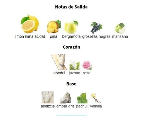 Desde el momento en que sus notas de salida se despliegan en el aire, se revela una sinfonía cautivadora de aromas frescos y vibrantes. El limón y la bergamota, con su chispeante y cítrica esencia, se entrelazan con la dulzura jugosa de la piña y la manzana. Estas notas iniciales, junto con un toque intrigante de grosellas negras, crean un cóctel olfativo audaz y energizante que deja una impresión duradera.