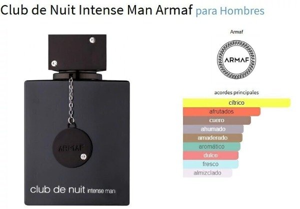 Club de nuit Intense Man de Armaf es una fragancia de la familia olfativa Amaderada Especiada para Hombres. Las Notas de Salida son limón, piña, bergamota, grosellas negras y manzana; las Notas de Corazón son abedul, jazmín y rosa; las Notas de Fondo son almizcle, ámbar gris, pachulí y vainilla.