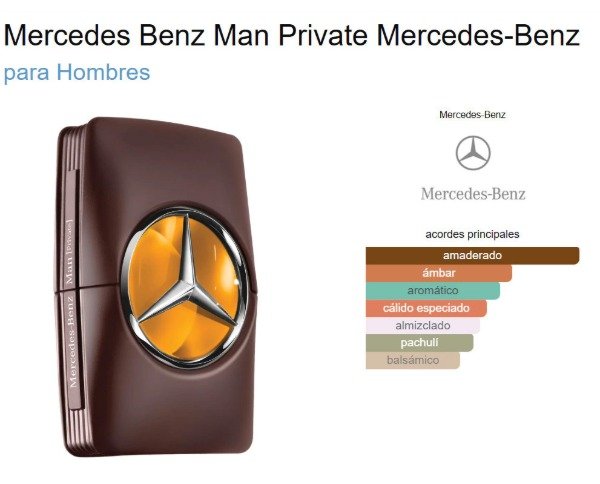 Mercedes Benz Man Private de Mercedes-Benz es una fragancia de lafamilia olfativa Oriental Amaderada para Hombres. Mercedes Benz ManPrivate se lanzó en 2018.La Nariz detrás de esta fragrancia es Olivier Cresp.Las Notas de Salida son ciprés, cardamomo y abrótano; las Notas deCorazón son ládano, ambroxan y lavanda; las Notas de Fondo son cedro,pachulí y madera de cachemira.