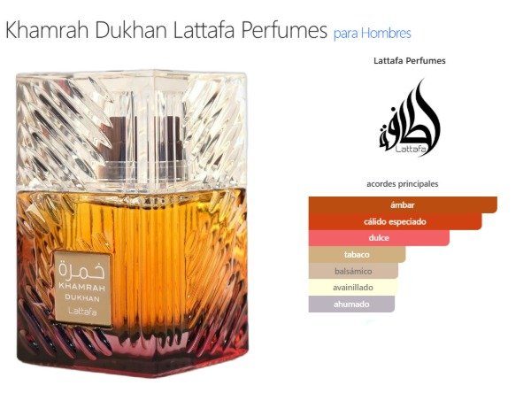 Khamrah Dukhan de Lattafa Perfumes es una fragancia de la familia olfativa Oriental para Hombres.