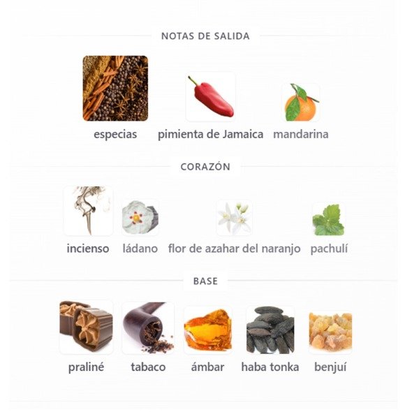 Las Notas de Salida son especias, pimienta de Jamaica y mandarina; las Notas de Corazón son incienso, ládano, flor de azahar del naranjo y pachulí; las Notas de Fondo son praliné, tabaco, ámbar, haba tonka y benjuí.
