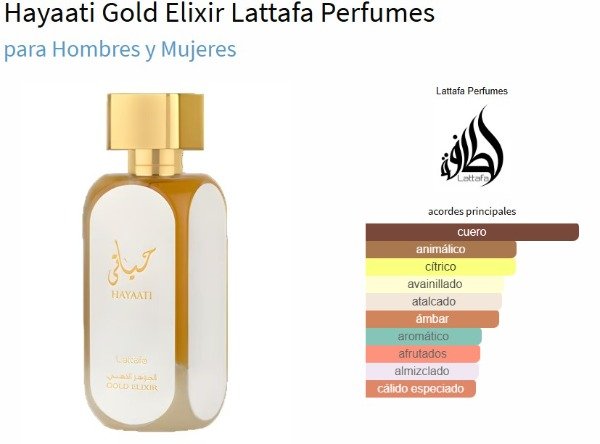 Hayaati Gold Elixir de Lattafa Perfumes es una fragancia de la familia olfativa ambar para Hombres y Mujeres. Las Notas de Salida son bergamota, pomelo y grosellas negras; las Notas de corazón son cuero, durazno y azafrán; las Notas de Fondo son vainilla, ámbar, almizcle y vetiver. Hayaati Gold Elixir es una fragancia cautivadora que fusiona la frescura cítrica de la bergamota y el pomelo con la dulzura tentadora de las grosellas negras y el durazno. Su corazón revela una armoniosa mezcla de cuero y azafrán, envuelta en la calidez de la vainilla y el ámbar. La seducción persiste con la profundidad del almizcle y la terrosidad del vetiver. Una sinfonía olfativa que encarna la elegancia y el misterio. Sumérgete en la opulencia de Hayaati Gold Elixir y despierta tu esencia única!